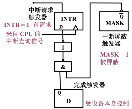 每台外部设备都必须配置一个中断请求触发器INTR,当其为“1”时,表示该设备向CPU提出中断请求。但是设备欲提出中断请求时,其设备本身必须准备就绪,即接口内的完成触发器D的状态必须为“1”。