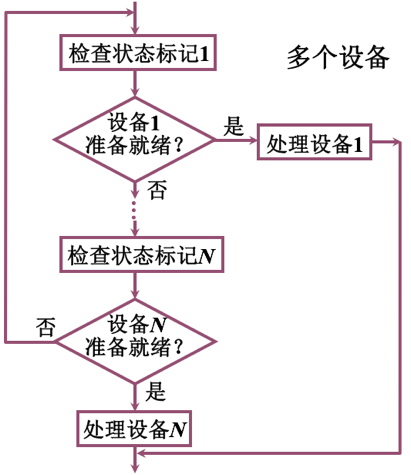由前面知识已知,程序查询方式的核心问题在于每时每刻需不断查询I/O设备是否准备就绪。上图是单个I/O设备的查询流程。
