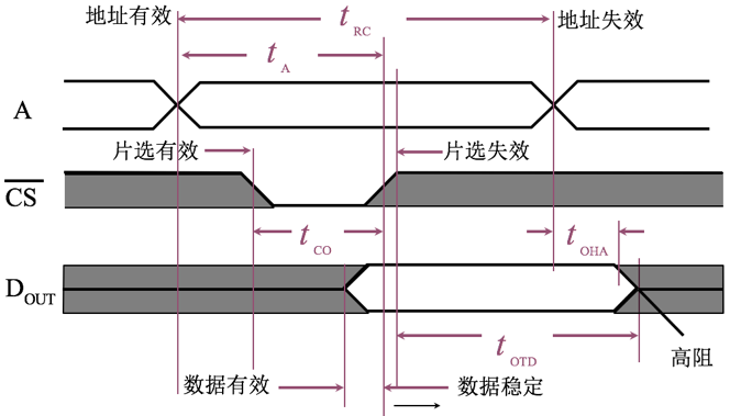 读周期tRC是指对芯片进行两次连续读操作的最小间隔时间。读时间tA表示从地址有效到数据稳定所需的时间,显然读时间小于读周期。