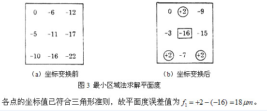 根据最小区域法确定理想平面,即可求出相应的p、q值,从而获得坐标变换,求出平面度误差值。