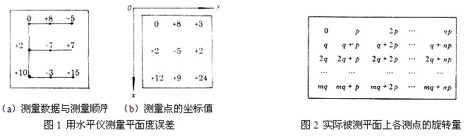 用水平仪测量某平板的平面度误差,按图1a所示的网格布点方式测得9个点共8个读数,试评定该平面的平面度误差值。