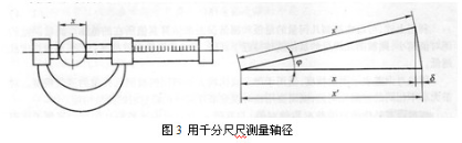 阿贝原则是指测量长度时,应将基准线安放在被测长度的延长线上,或顺次排成一条直线。如图3所示,用千分尺测量轴径,千分尺的标准线与工件被测直径在同一直线上,即符合阿贝原则。如果测微螺杆轴线与被测直径间存在一夹角φ,由此产生的测量误差δ为: