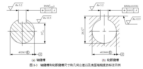 轴键槽和轮毂键槽的剖面尺寸及其公差带、键槽的几何公差和表面粗糙度轮廓要求、所采用的公差原则在图样上的标注示例如图8-3所示,其中图8-3a为轴键槽标注示例,对称度公差采用独立原则;图8-3b为轮毂键槽标注示例,对称度公差采用最大实体要求。