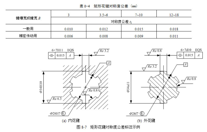 若是规定对称度公差(见表8-4),则应注意键宽的对称度公差与小径定心表面的尺寸公差关系则应遵守独立原则。内、外矩形花键的对称度公差的图样标注如图8-7所示。另外,对于较长花键,可根据产品性能自行规定键侧对轴线的平行度公差。