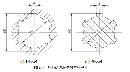 GB/T1144-2001《矩形花键尺寸、公差和检验》规定了矩形花键的主要尺寸有小径d、大径D、键宽和键槽宽B,如图8-4所示,其中图8-4a为内花键(花键孔);图8-4b为外花键(花键轴)。键数N规定为偶数,有6、8、10三种,以便加工和检测。按承载能力,对公称尺寸规定了轻、中两个系列,同一小径的轻系列和中系列的键数相同,键宽(键槽宽)也相同,仅大径不相同。中系列的键高尺寸较大,承载能力强,轻系列的键高尺寸较小,承载能力相对低。矩形花键的尺寸系列见附表8-2。