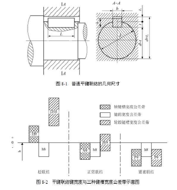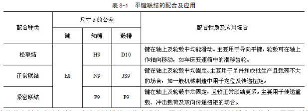 国家标准GB/T1095-2003《平键  键槽的剖面尺寸》和GB/T1096-2003《普通型  平键》规定按轴径确定键槽和平键尺寸。它们的公差带则从GB/T1801-2009《极限与配合  公差带和配合的选择》中选取,对键的宽度规定一种公差带h8,对轴和轮毂键槽的宽度各规定三种公差带,这样键宽度公差带分别与三种键槽宽度公差带构成三种不同性质的配合。根据不同的使用要求,键与槽宽可以采用不同的配合,分为松联结、正常联结和紧密联结等三种配合,以满足各种用途的需要,如图8-2所示。各种配合的配合性质和应用场合见表8-1。