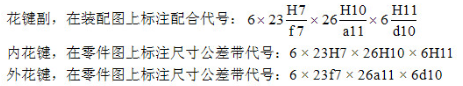 矩形花键的规格按下列顺序表示:键数N x 小径d x 大径D x 键宽(键槽宽)B。按照这个顺序在装配图上标注花键的配合代号和在零件图上标注花键的尺寸公差带代号。例如,花键续数N为6、小径d的配合为23H7/f7、大径D的配合为26H10/a11、键槽宽与键宽B的配合为6H11/d10的标注方法如下: