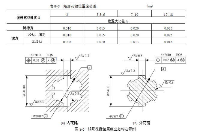 内、外花键是具有复杂表面的联结件,且键长与键宽的比值较大,因此还需有几何公差要求。为保证配合性质,内、外花键的小径定心表面的形状公差和尺寸公差的关系应遵守包容要求。几何公差若是规定位置度公差(见表8-3),则应注意键宽的位置度公差与小径定心表面的尺寸公差关系均应符合最大实体要求。内、外矩形花键的位置度公差要求的图样标注如图8-6所示。
