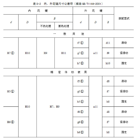 矩形花键联结的公差与配合分为两种情况:一种为一般用途矩形花键,另一种为精密传动用矩形花键。其内、外花键的尺寸公差带见表8-2。