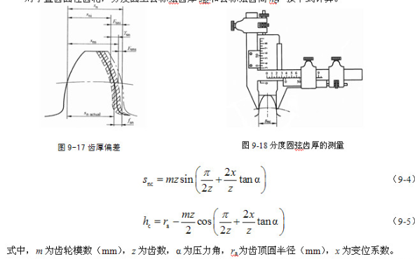 是指在分度圆柱面上,实际齿厚与公称齿厚(齿厚理论值)之差,如图9-17所示。对于斜齿轮,指法向齿厚。
