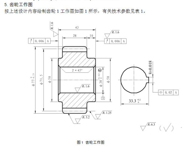 (1)盘形齿轮的基准面是:齿轮安装在轴上的基准孔、切齿时的定位端面和齿顶圆柱面。精度设计时主要考虑:基准孔直径的尺寸公差并采用包容要求,不采用包容要求时需给定形状公差;定位端面对基准孔轴线的轴向圆跳动公差;齿顶圆柱面的直径尺寸公差;有时还要规定齿顶圆柱面对基准孔轴线的径向圆跳动公差。