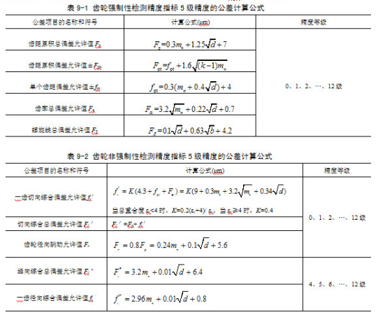 只规定了4~12级共9个精度等级。5级是各级精度综合的基本级,表9-1和表9-2分别列出了强制性检测和非强制性检测精度指标5级精度公差的计算公式。表中,