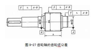 (2)齿轮轴的基准面是:齿轮轴支承轴颈,齿顶圆柱面。其精度要求如图9-27所示。精度设计时主要考虑:两个轴颈的直径尺寸公羡并采用包容要求,不采用包容要求时需给定形状公差;两个轴颈对它们的公共轴线(基准轴线)的径向圆跳动公差;齿顶圆柱面的直径尺寸公差;以齿顶圆柱面作为测量齿厚的基准时,需规定齿顶圆柱面对两个轴颈的公共轴线(基准轴线)的径向圆跳动公差。