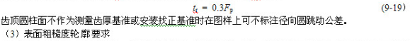 齿轮齿面、盘形齿轮的基准孔、齿轮轴的轴颈、基准端面、径向找正用的圆柱面和作为测量齿厚基准的齿顶圆柱面的表面粗糙度轮廓幅度参数值,可按附表9-7确定。