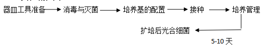 光合细菌能够利用太阳能同化二氧化碳,利用水分、碳源(有机化合物和碳氢化合物)、氮源(无机氮和有机氮)、生长因子(B族维生素和某些氨基酸或核酸)以及微量元素(铜、钾、镁、硫、磷、氯等)作为营养物质,在适宜温度(23-39℃)、PH(中性至微碱性)、光照、溶氧等条件下,培养7-10天,可以达到指数生长期高峰,便可扩种或作为饵料。