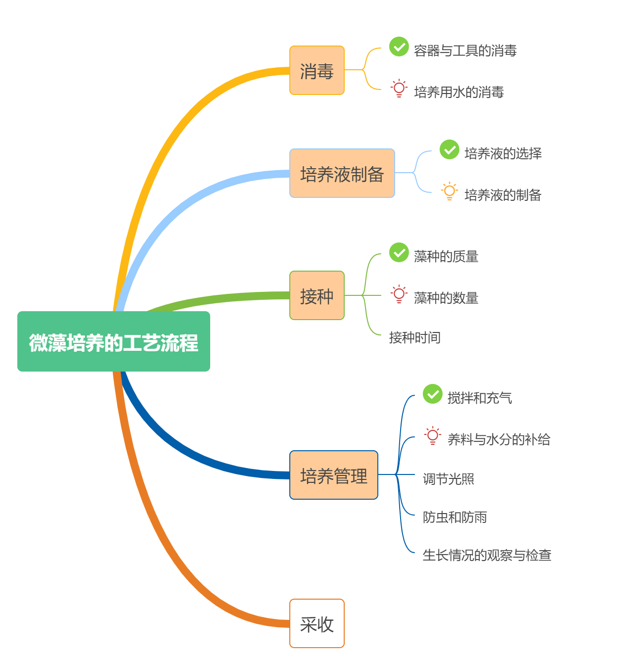 微藻培养的工艺流程主要有下面下几步:1.培养容器、工具和培养用水的消毒2、培养液的配置3、接种 4、培养过程的日常管理 5、采收 6、干燥。