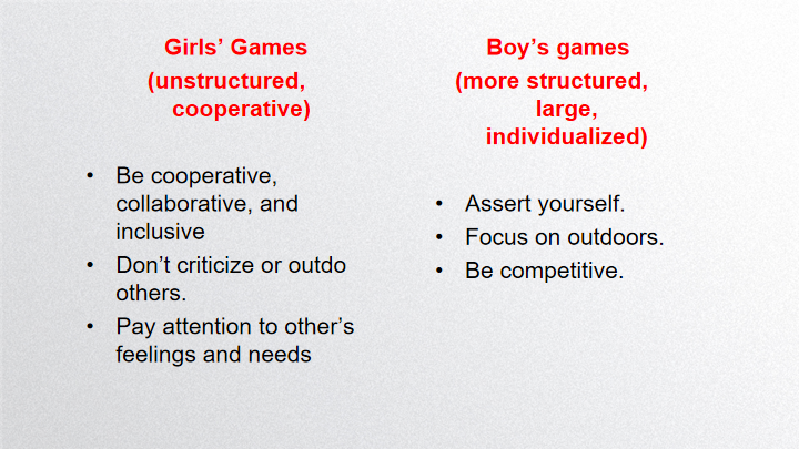 Girls’ games occur within a gender culture that emphasizes cooperation, sensitivity toward others, and experience more than outcome.