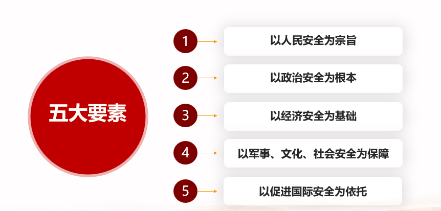 国家总体安全观是一个系统的思想体系,其核心要义包括:“五大要素”和”五对关系“。