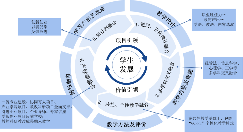 本课程以“以学生发展为中心、产出导向、分类培养、个性化教学”为教学理念。构建“一中心 双引领 五融合”的课程整体育人体系,即以学生发展为中心,坚持“价值引领”、以真实项目贯穿全过程。在教学设计上采用逆向设计、在教学内容选取上突出多学科融合,创新个性化教学模式,以产学研协同育人为保障,鼓励学生创新创业。