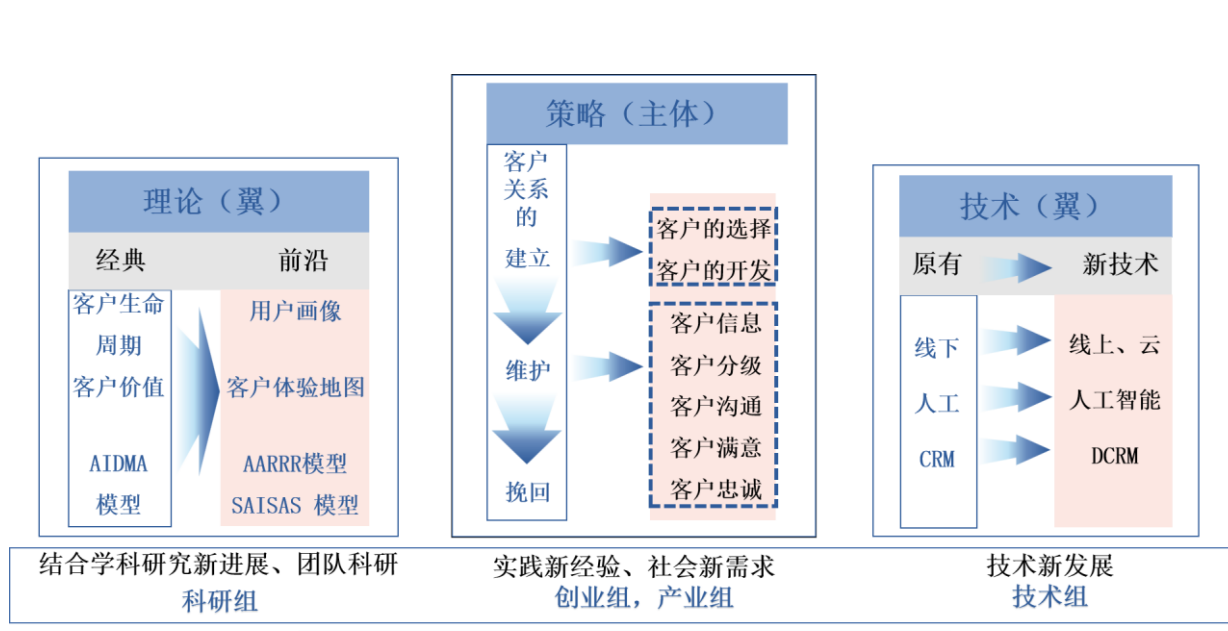 ”一体两翼”,即:以客户关系管理的“策略”为主体,以客户关系的“建立→维护→挽回”的时间逻辑整合内容;两翼,以“理论”、“技术”为两翼,并结合研究新进展、实践新经验、技术新发展不断更新内容。