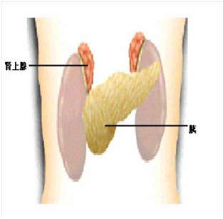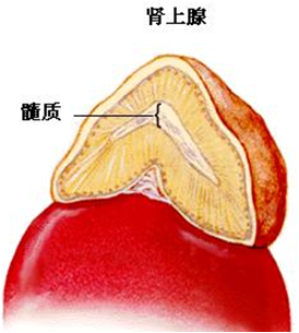肾上腺位于肾脏的上方,左右各一,肾上腺分为两部分:外周部分为皮质,占大部分;中心部分为髓质,占小部分。