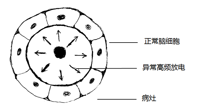 ◆ 继发性:脑瘤、脑寄生虫、脑血管畸形、脑外伤等所致。脑部存在病灶,异常高频放电,病灶所处部位,放电侵犯区域大小,决定临床发作类型及症状轻重。如图所示:
