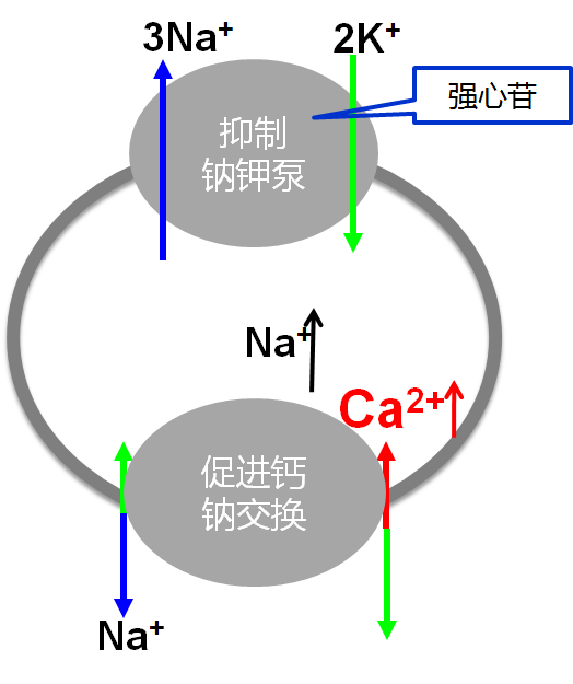 通过抑制衰竭心肌细胞膜上Na+-K+-ATP酶→细胞内Na+水平↑→促进Na+-Ca2+交换,提高细胞内Ca2+ 水平,从而发挥正性肌力作用。