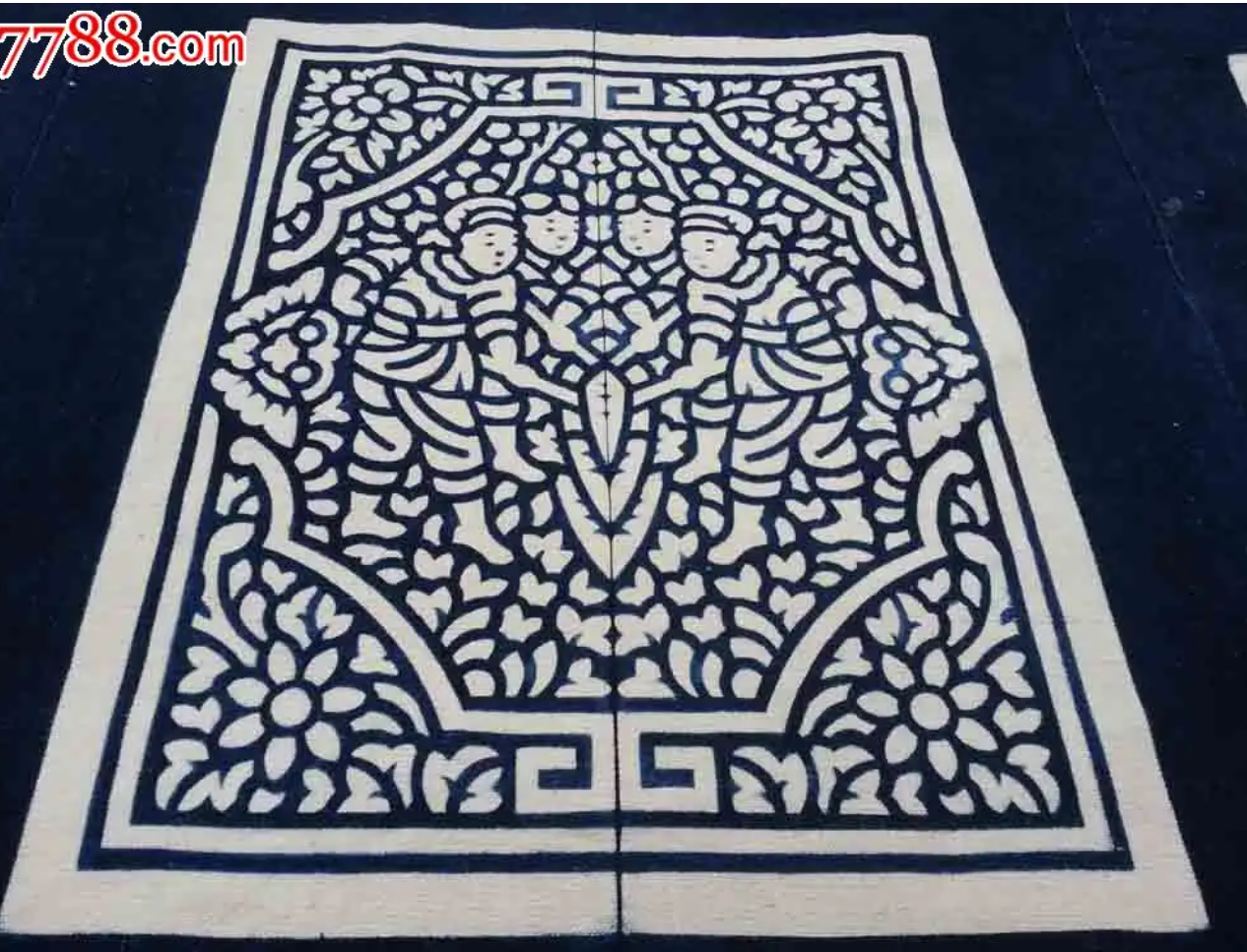 一块白布,盖上模板,刮入豆粉,晾干,放入染缸,刮去豆粉,洗净——这叫灰染