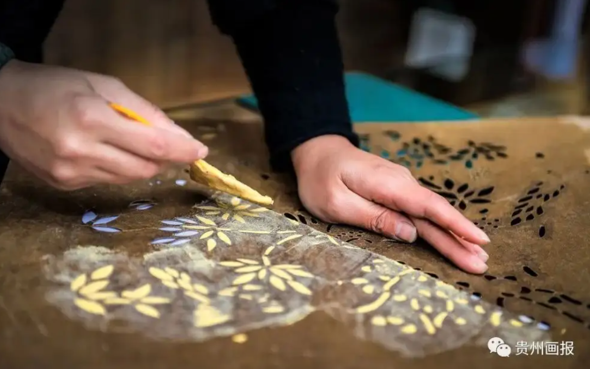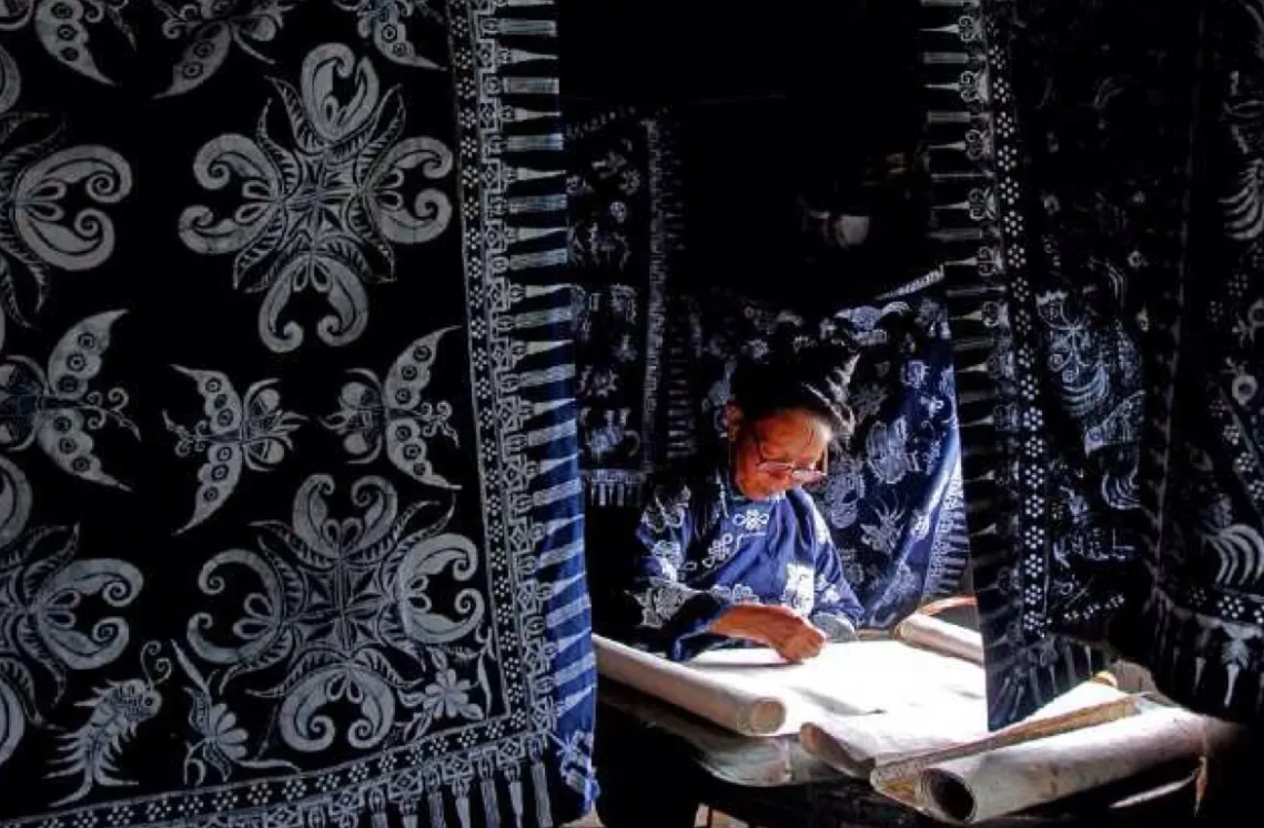 一块白布,用蜡刀占蜡,画出不同的图形,放入染缸,去掉封蜡,晾干——这个是蜡染