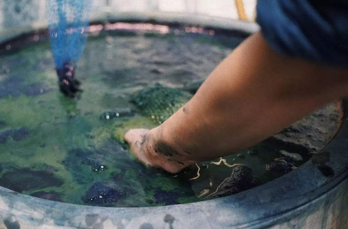 蓝染是一门古老的染色技艺,广泛流传在广西少数民族地区。是用一种叫蓝靛草的植物,通过复杂的发酵工序制成蓝靛料泥。蓝靛泥混合土碱及发酵剂等开成染缸。