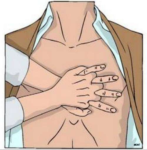 骨正中线的交界处;触摸法适用于女性患者,抢救者用触摸颈动脉一手的食指和中指,沿患者的靠近抢救者一侧的肋弓下缘向上滑行到两侧肋弓的汇合点(即胸骨下切迹),将中指定位于下切迹处,食指与中指并拢,另一手的掌根紧靠在食指旁。放在胸骨上的手指向上方跷起,不能搭在胸壁上,将另一手掌的根部重叠于前者之上,手指互扣,双臂伸直;然后救护者凭自身前倾重力通过双臂和双手掌向胸骨下半部加压,使胸骨下陷至少125px,而后迅速放松,反复进行,每次减压时胸骨抬起,与胸骨接触的手掌不应离开胸骨以免已确定的按压部位发生改变,但也不应阻碍胸骨的抬起。按压时间与放松时间比例1:1。保持频率为至少100次每分钟的按压30次。