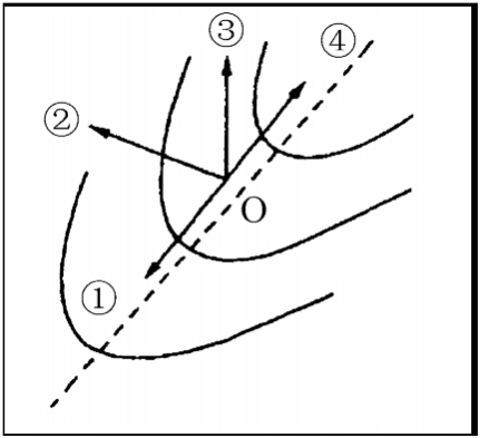 注:虚线为泥石流路线,实线为等高线,O为人员位置。