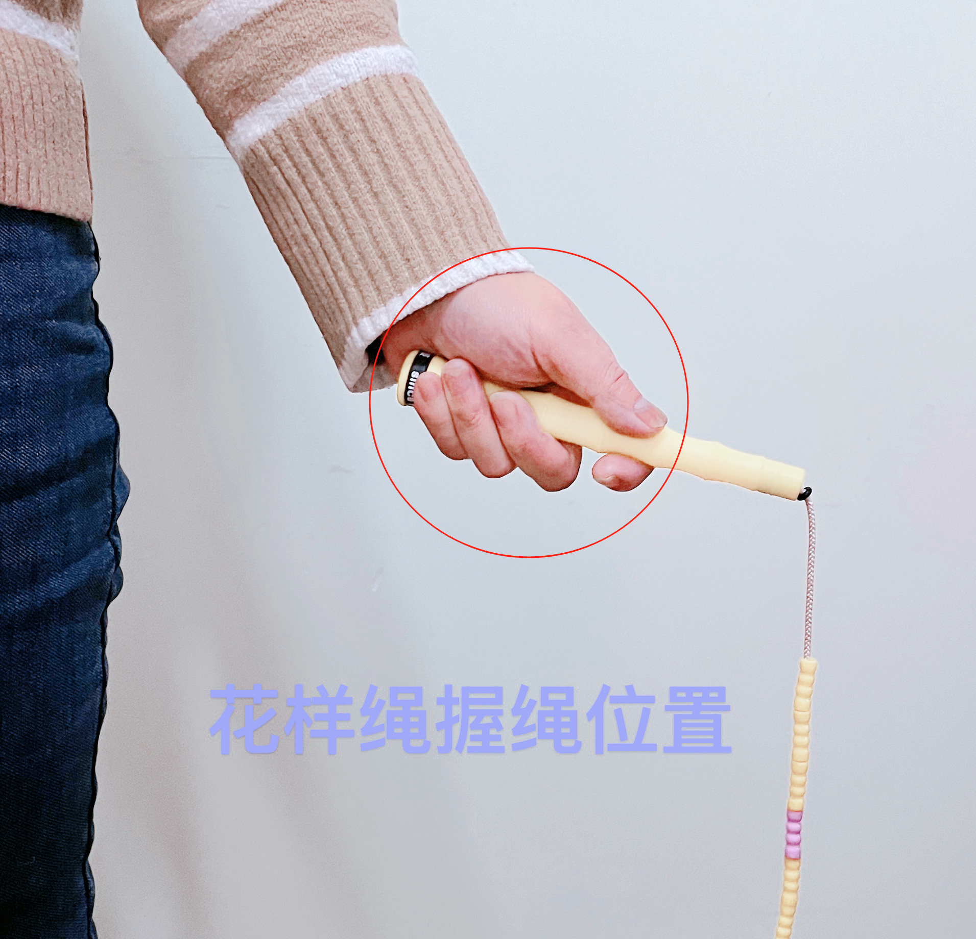 一、花样绳握绳方式:握于绳柄末端,大拇指与食指发力捏住绳柄,其余三指自然贴合绳柄。