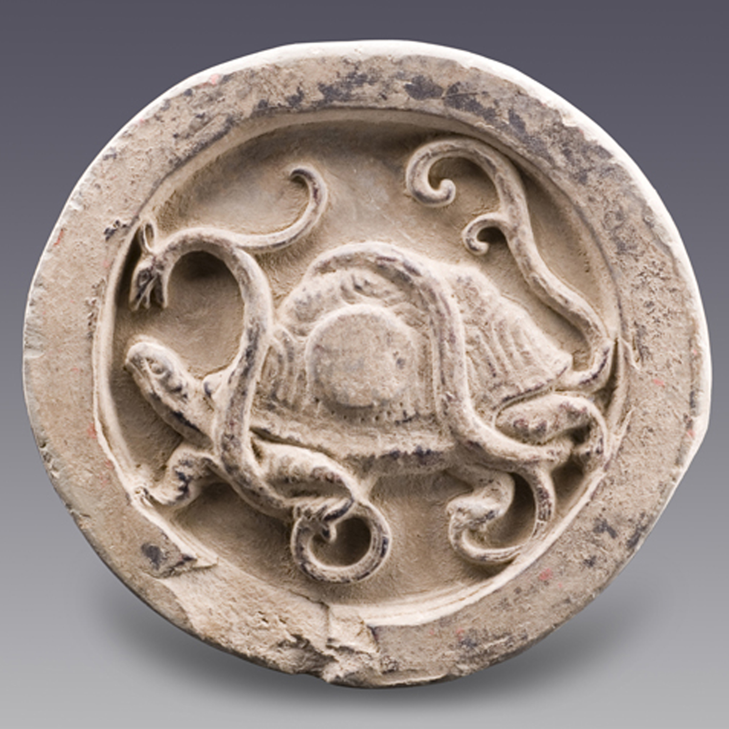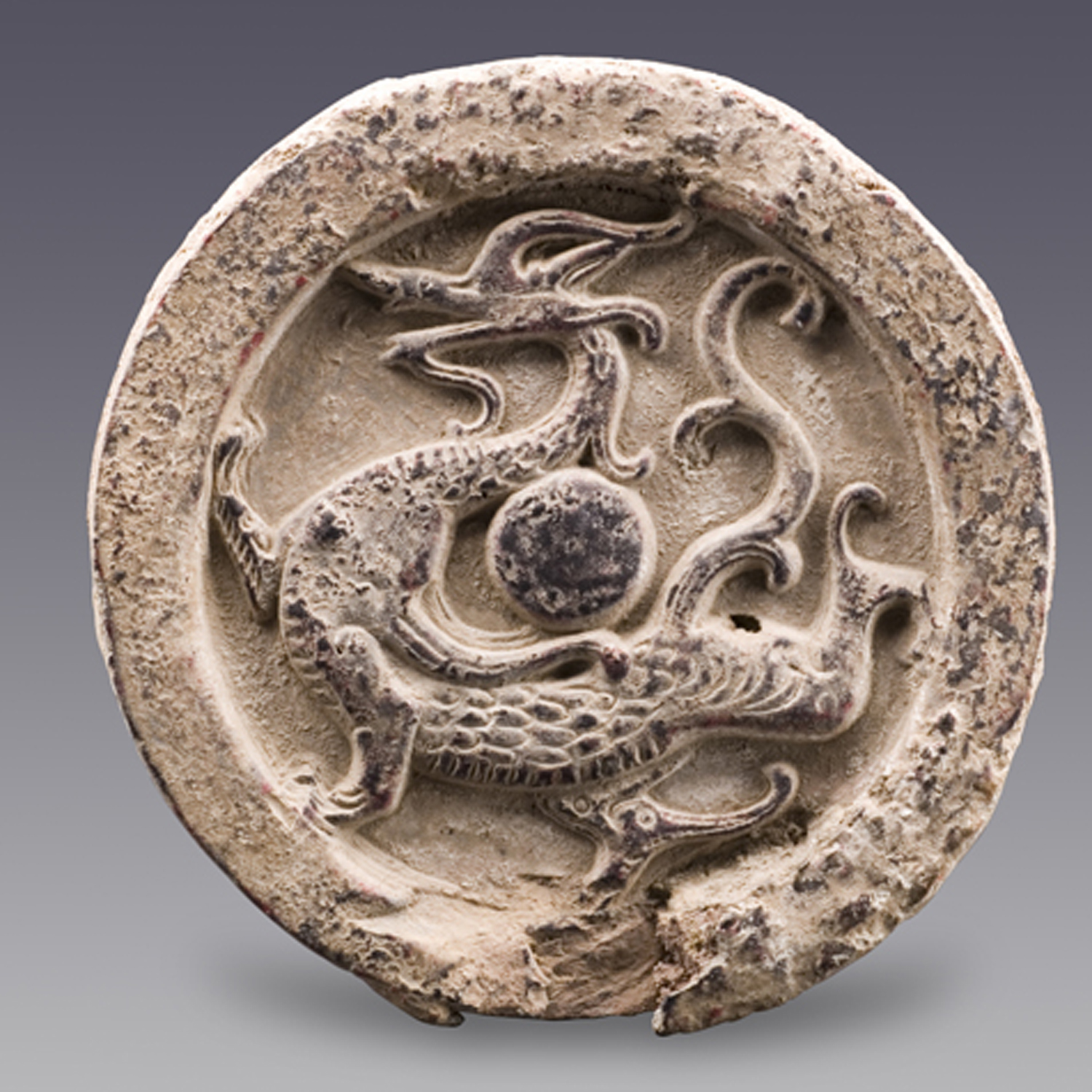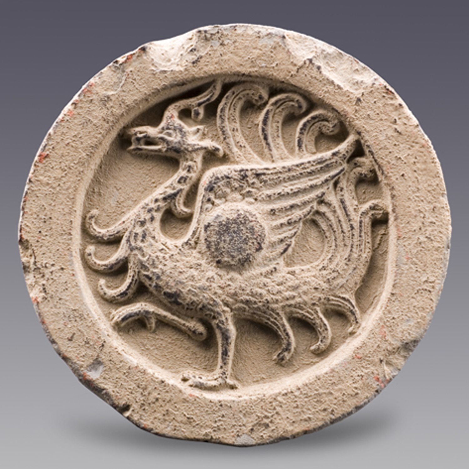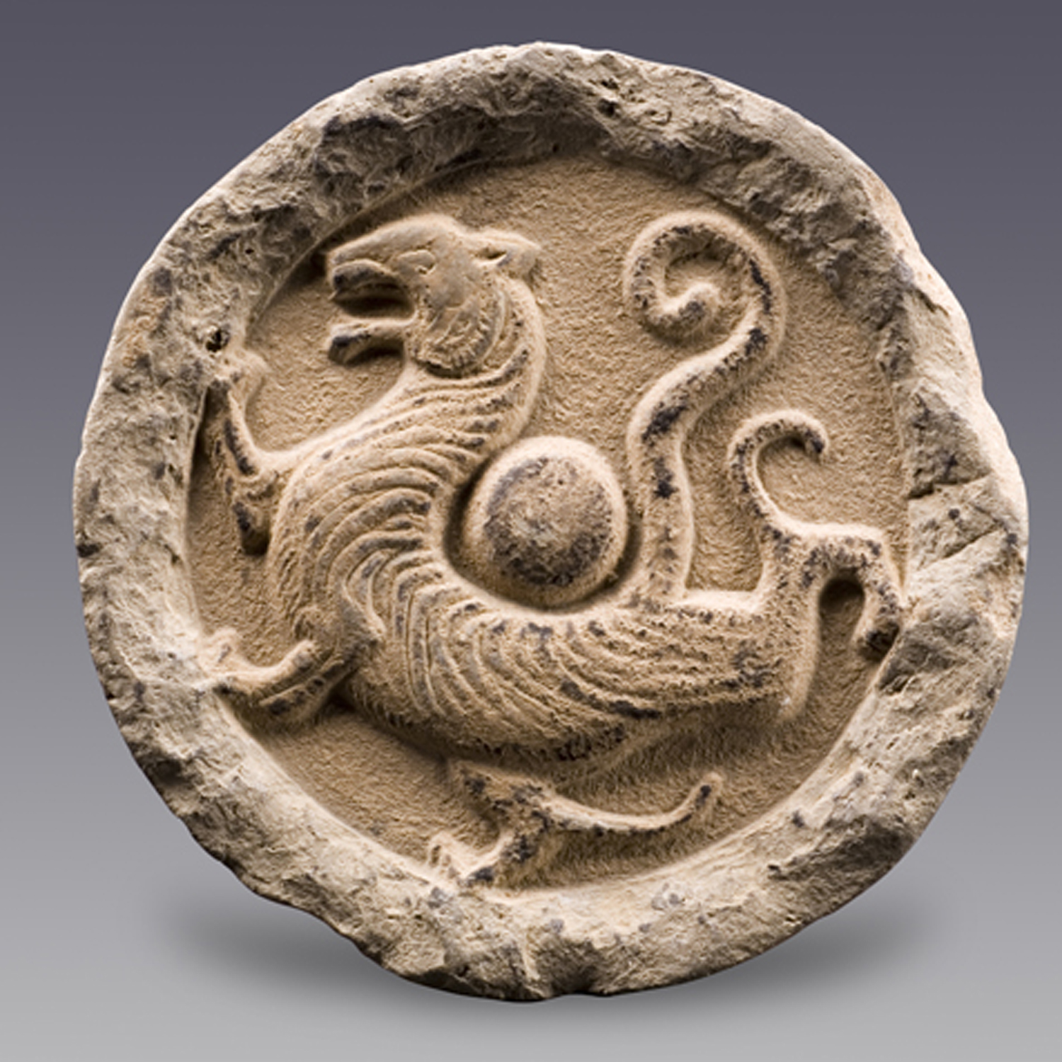 瓦当是中国古代建筑檐头筒瓦前端的遮挡,一般为泥质,烧制温度较高,质地坚硬,呈青灰色,有半圆(简称“半瓦当”)和圆形的两种。纹饰有卷云纹、四神纹、文字瓦当、动物纹、植物纹等。西汉晚期的青龙、白虎、朱雀、玄武四神造型最为完美(主要用于礼制建筑,四神在古代分别代表天上东、西、南、北四个方位的星宿,有护佑四方的神力);其余如麟、凤、兔、天禄、辟邪、饕餮等。瓦当的结构有对称结构、中心辐射结构、任意型结构。