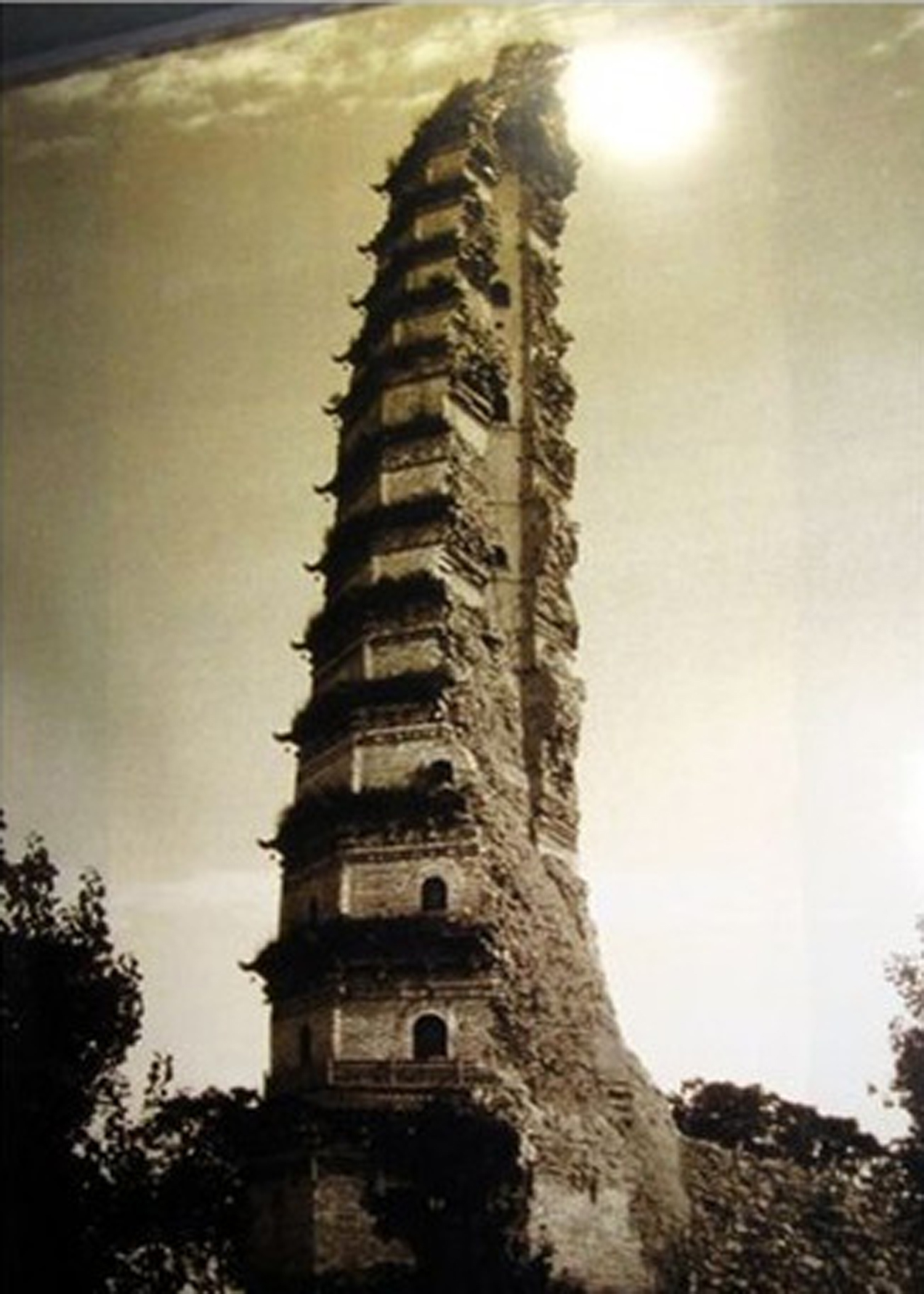 图3-56被雷电劈开的法门寺塔 图3-57重修后的法门寺塔