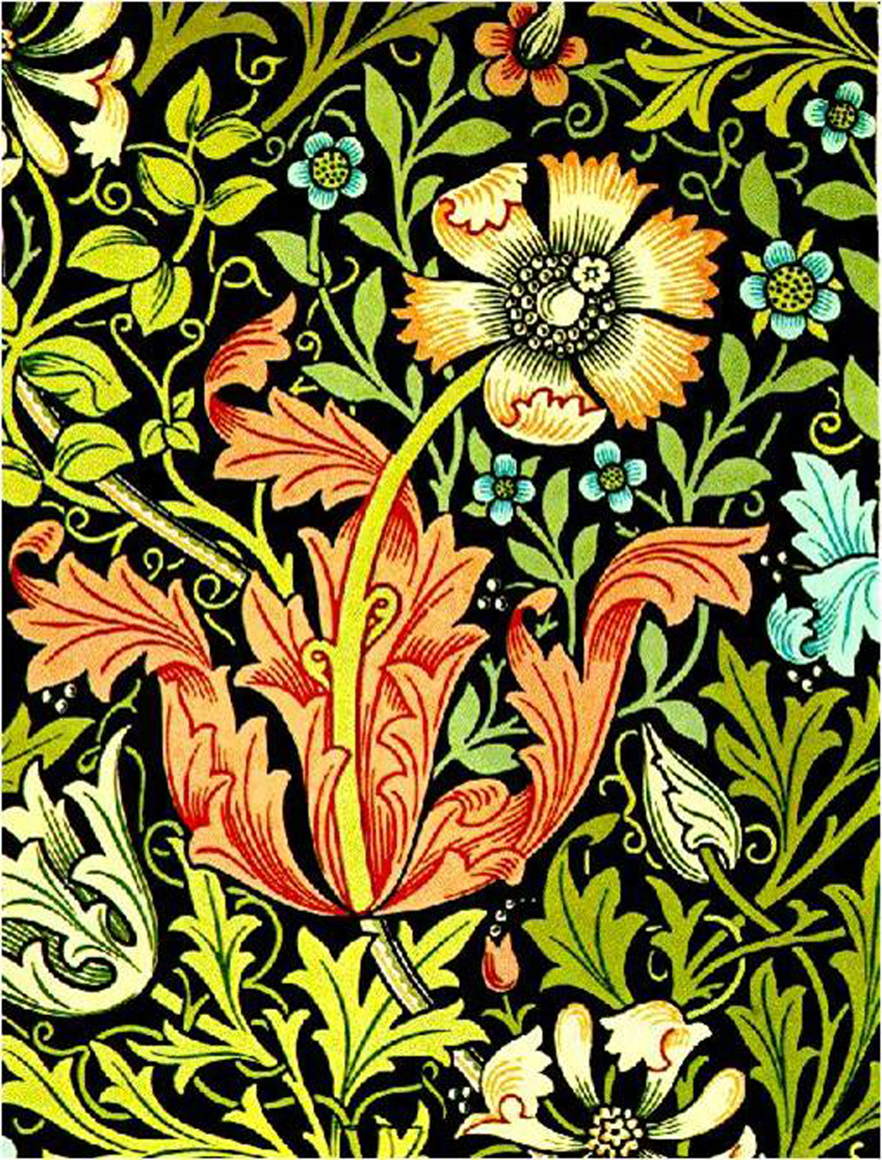 图4-59莫里斯设计的花卉图案推崇自然主义、东方装饰和东方艺术的特点,采用大量卷草、花卉、鸟类为装饰动机。