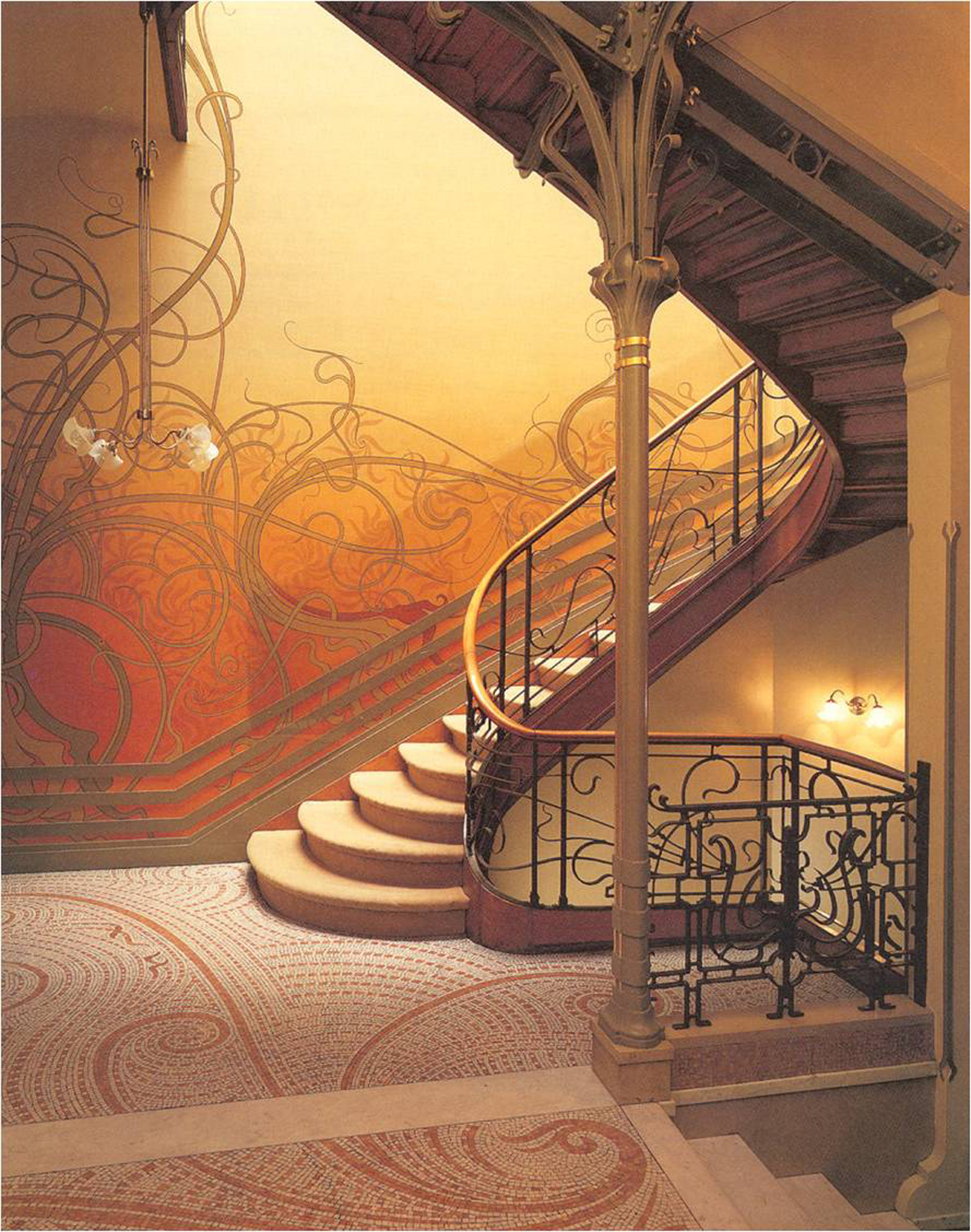 代表“新艺术运动”建筑的最高水平是 “新艺术运动”建筑师的杰出代表之一维克多·霍塔(1867—1947),他在建筑与室内设计中经常使用葡萄蔓般相互缠绕和螺旋扭曲的线条被称为“比利时线条”或“鞭线”,它起伏有力,色彩协调,墙面柔和,室内的栏杆、墙纸、地板陶瓷镶嵌、灯具、窗户等都采用统一的“新艺术运动”风格,成为了比利时新艺术的代表性特征。