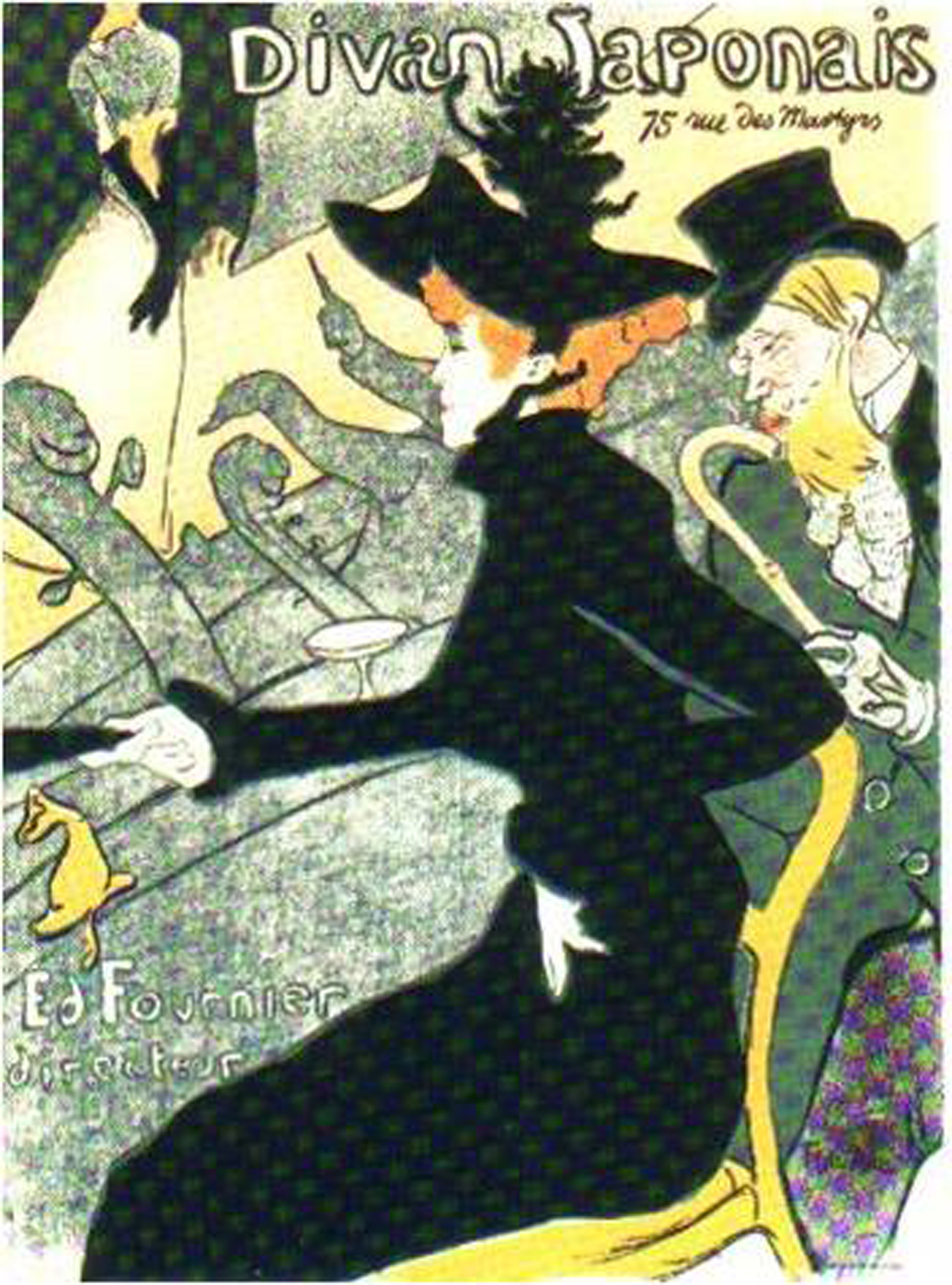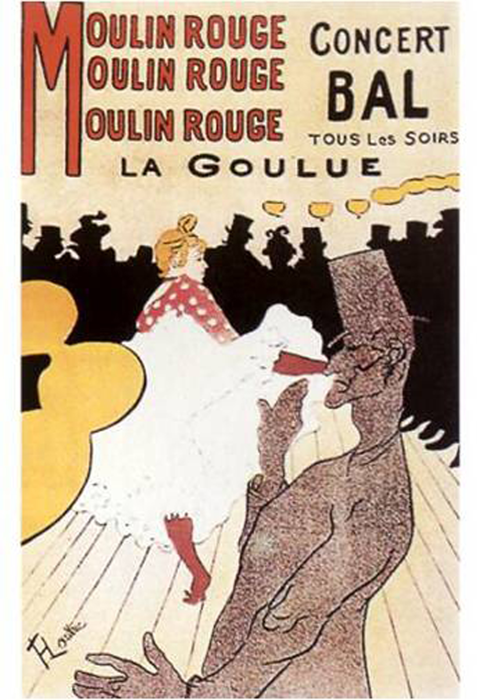 儒勒·舍雷因在1866年把从英国学来的色彩石版技法运用到广告印刷上,使此法风靡一时而被称为现代“广告之父”。他一生设计了几百幅罗可可线条和亮色块为特征的招贴。土鲁斯·劳特累克(1864~1901)设计的《快乐王后》、《简·阿伏勒》和《红磨坊》歌舞演出海报的招贴用线条来勾勒物体与人物,选取日常生活的题材,令人感到亲切,文字与图形的巧妙安排,有力的对比等,在视觉传达设计中迈出了技术与艺术结合、艺术为商业服务的步子。