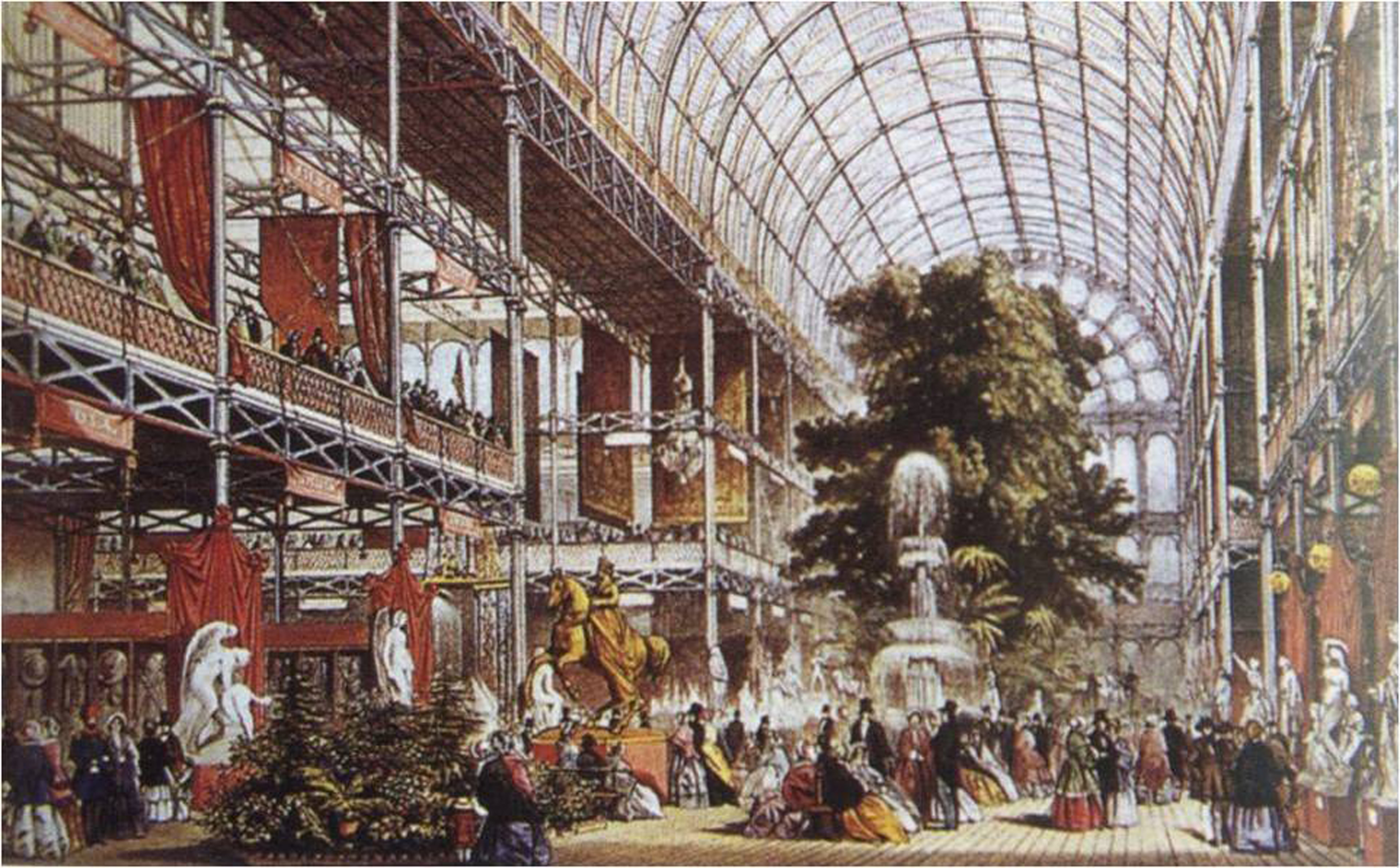 1851年,维多利来女王发起组织了第一届世博会,当时由于时间紧博览会的主办者被迫接受了来自皇家园艺总监约瑟夫·帕克斯顿(Joseph Paxton,1801-1865)的救急方案——由钢铁骨架和平板玻璃组装而成的花房式大厅会场,便是著名的“水晶宫”。