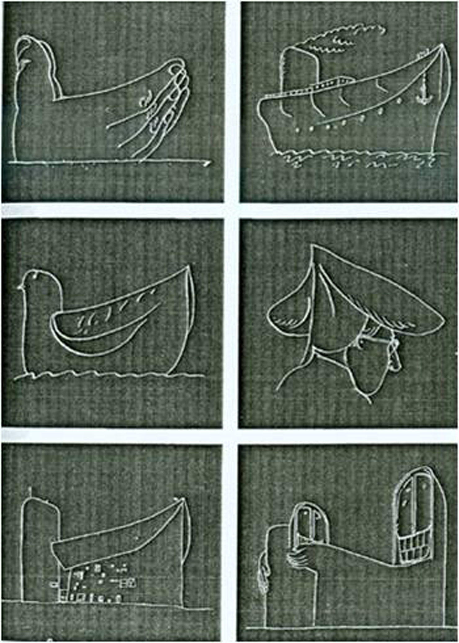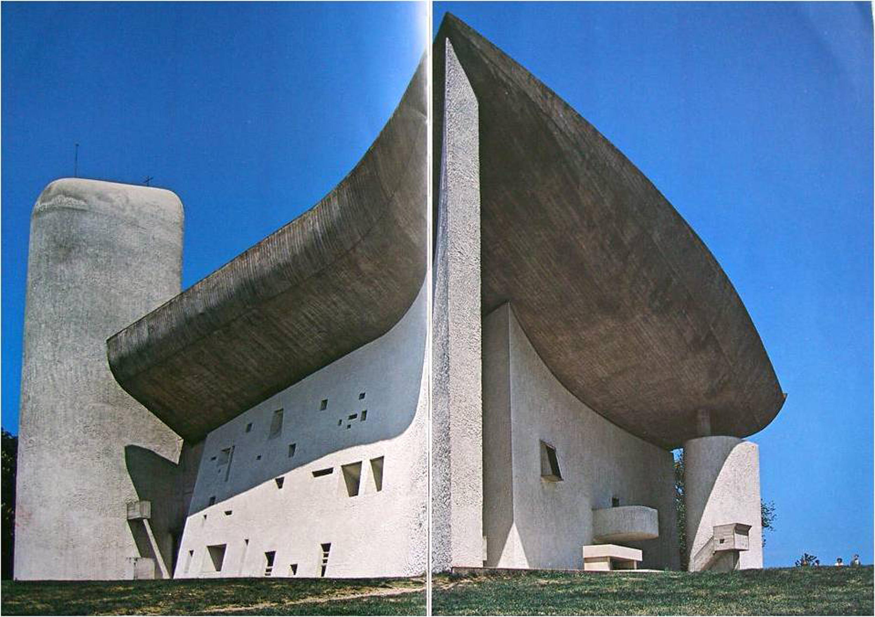 图6-15(2)五种“解读” 朗香教堂的体型隐喻着(1)“一双祈祷的手”;(2) “一艘轮船”;(3) “一只鸭子”;(4)它像一个牧师的后侧头影;(5)它像两个修女,一高一矮。从这里我们已足可窥见建筑的象征与隐喻的多义性,也从另一个方面反映了建筑象征与隐喻的魅力和规律。