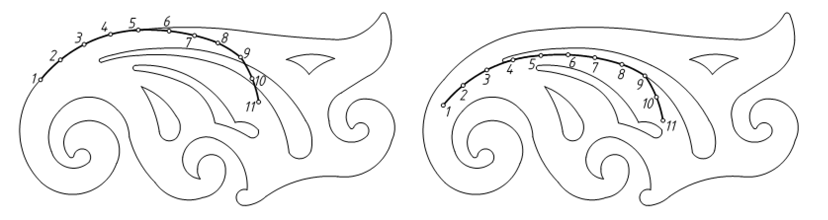 曲线板是用来绘制非圆曲线的常用工具。画图时,先徒手把曲线上已求出的各个点轻轻地勾画出来,然后从曲线的一端开始找出曲线板上与已知点相吻合的线段,一般应不少于四个点。如图2-15中,已求出一段曲线上的8个点,先在曲线板上找到与1、2、3、4点吻合的曲线,画出1、2、3点之间的曲线,留出3、4之间曲线不画,然后从3点开始再找出后面连续的4个点分段将曲线光滑连接,如图2-15所示。