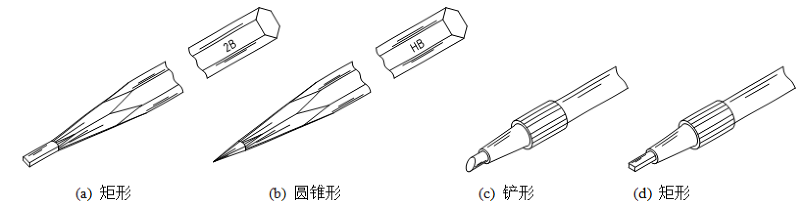 用于画粗实线的铅笔应磨成矩形断面,如图2-13(a)所示。打稿、画细线以及写字的铅笔应磨成圆锥形,如图2-13(b)所示。画各类细线圆时,用H或HB的铅芯,并磨成铲形,如图2-13(c)所示。画粗实线圆时,为了与粗实线的深浅一致,圆规的铅芯应比画直线的铅芯软一个等级,一般可用2B,并磨成矩形截面,如图2-13(d)所示。
