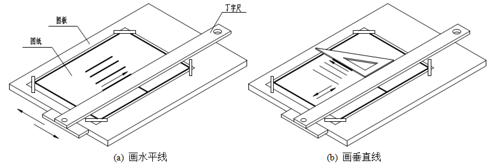 画图时,丁字尺尺头始终紧靠图板左侧的导边,上下移动用来画水平线,如图2-11(a)所示。三角板和丁字尺配合使用,可画垂直线。画垂直线时,应将三角板一直角边紧靠在丁字尺上,从下向上画,如图2-11(b)所示。