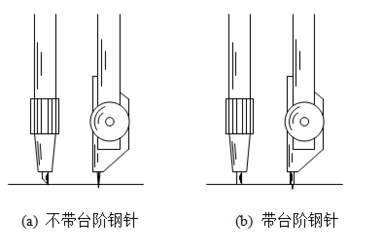 画图时,注意调整针脚的位置,针尖略长于铅芯。画细线圆时,可用不带台阶的钢尖,如图2-14(a)所示。加深粗线圆的时,避免钢尖插入图板太深,应该用带台阶那端的钢针,如图2-14(b)所示。