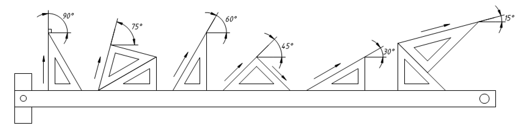 三角板有45º和30º/60º两块。三角板与丁字尺配合使用可画出垂直线及75º、60º、45º、30º、15º的斜线,如图2-12所示。