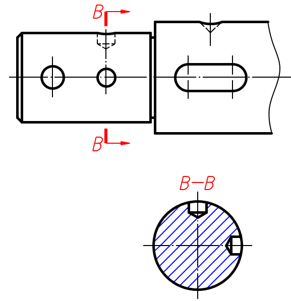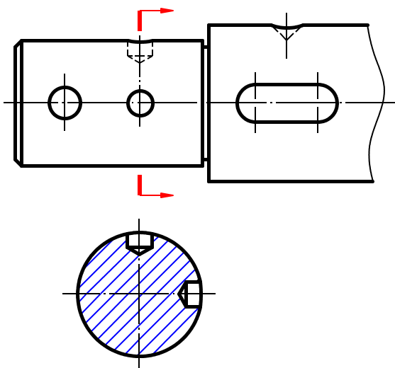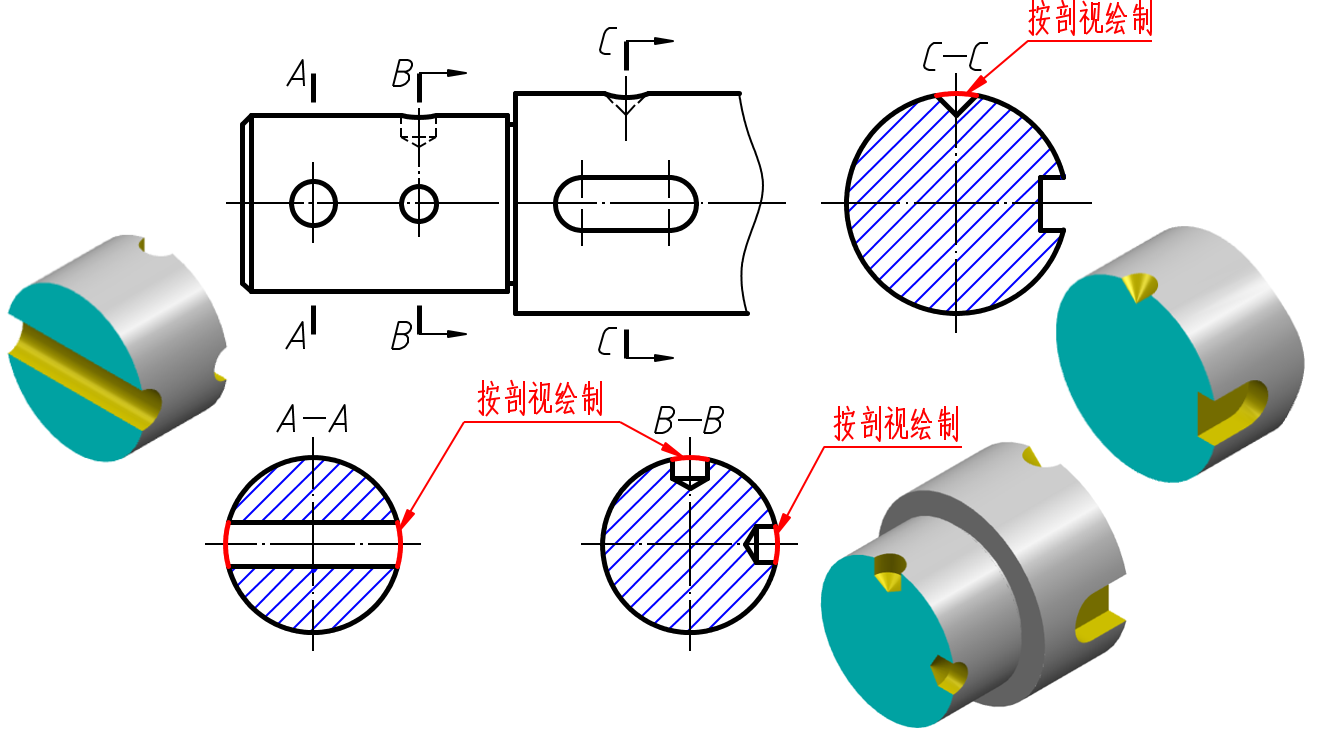 (2)当剖切平面通过回转面形成的孔或凹坑的轴线时,这些结构应按剖视绘制。