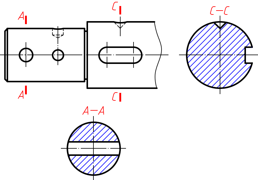 一般应在断面图的上方标注名称“×—×”(“×”为大写的拉丁字母),在相应视图上用剖切符号或剖切线表示剖切位置,用箭头表示投射方向,并注明相同的字母。