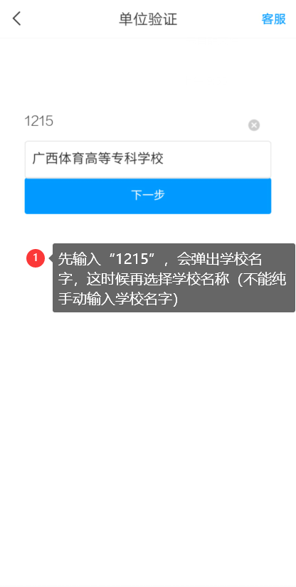 3、在输入框输入单位UC码:1215,输入1215以后,会弹出学校名字,这时候再选择学校名字(一定要输入1215,不能直接输入学校名称,也不能只输入1215,不选择学校)