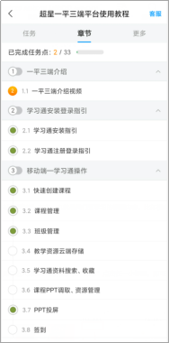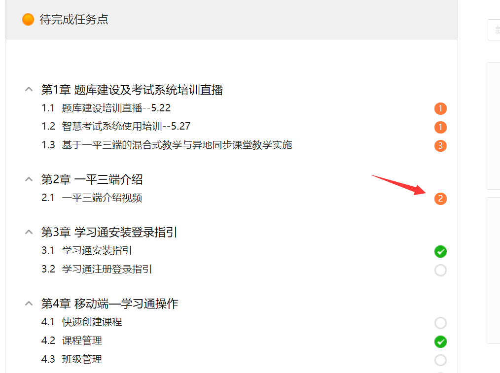 点击相应章节,即进入到了学习页面,点击视频播放观看完视频,完成章节测验即可通过本节学习。(如图2.1一平三端介绍视频的黄圈表示的两个任务点)