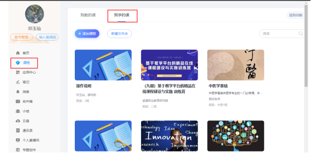 在个人学习空间“课堂”-“我学的课”里即可看到所选修的课程,点击课程封面进入课程详细页面,按照顺序完成学习任务。